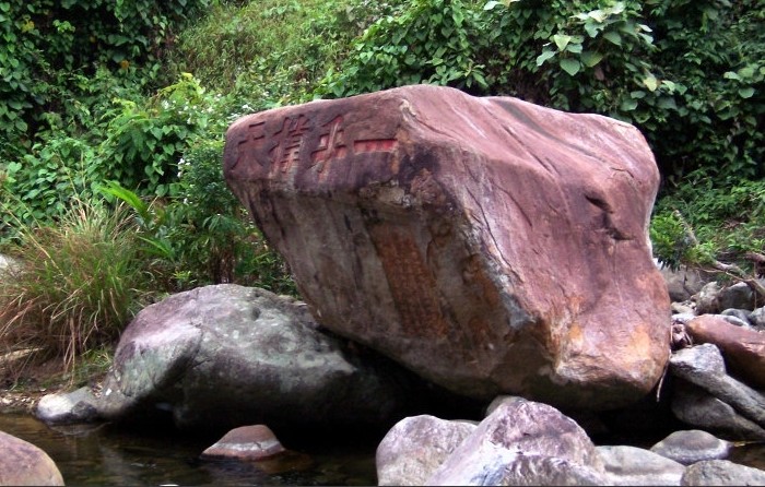 位于海南瓊中縣上安鄉(xiāng)仕階村,在五指山與湯匙嶺之間的東邊大巖石上,距五指山僅5公里,距上安鄉(xiāng)13公里,離縣城營根39公里。一片清代光緒十三年春砌志,是清朝將領(lǐng)馮子才及幕僚刻石,其中,“手辟南荒”、“一手撐天”、“百越鎖鑰”、“巨手擎天”等摩崖石刻群。字大如斗,筆法渾厚,氣勢磅礴。明代大學士邱浚的詠五指山詩曰“五峰如指翠相連,撐起炎荒半壁天。夜盥銀河摘星斗,朝探碧落弄云煙。雨余玉筍空中現(xiàn),月出明珠掌上懸。豈是巨靈伸一臂,遙從海外數(shù)中原”。