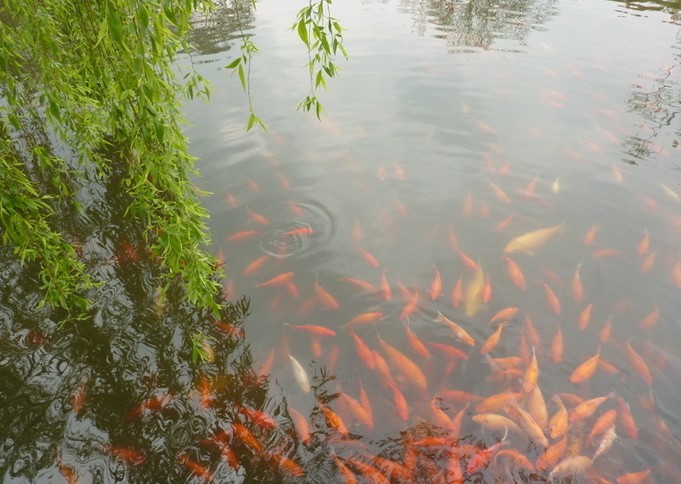 還有種說法:“花港觀魚”四字為清康熙皇帝手跡。康熙一生崇信佛教,向有“佛爺”、“善人”之稱。他孫子乾隆爺也崇尚“好生之德”。然而,在漢字里,三點為水,四點為火。繁體“魚”字底部的四點,本為火字,魚遇水而生,遇火必死。皇帝不忍見魚死,便將碑文中“魚”字底部的四點改寫成了三點,意在讓魚永遠歡快地生活在水里,以示皇恩浩蕩,澤被萬物之意。這也給后人留下了一段有趣的典故。