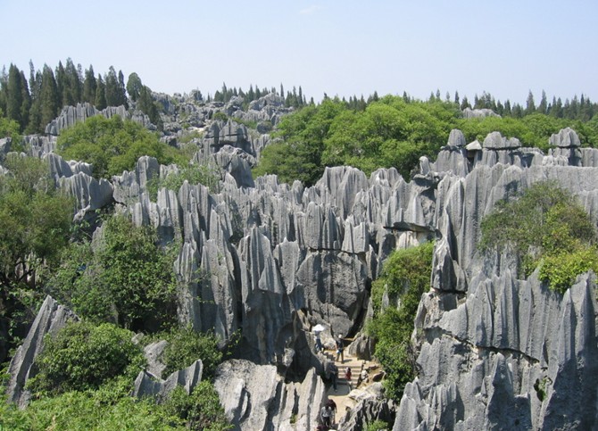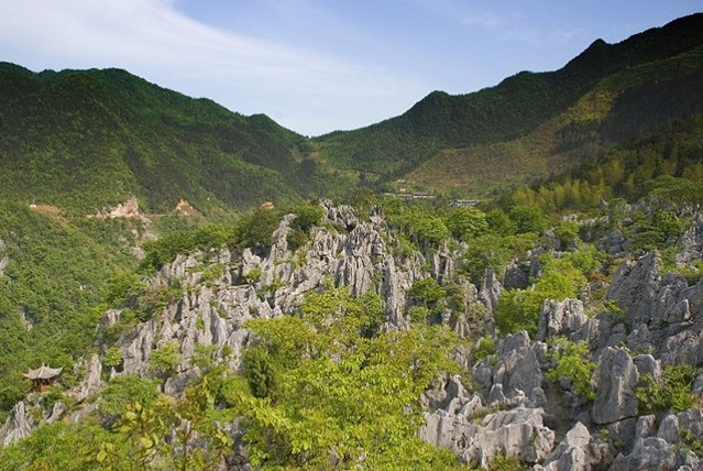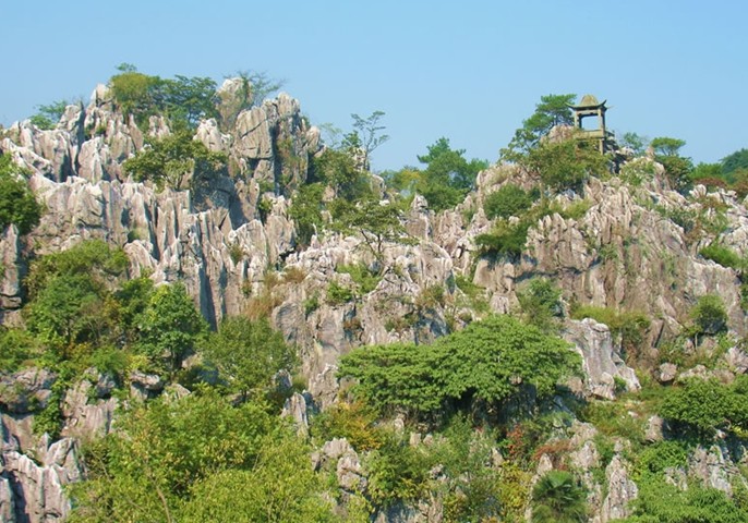 千島湖石林景區(qū)面積20平方公里,是中國四大石林之一。它位于杭州地區(qū)西邊的淳安縣千島湖,其面積之廣,規(guī)模之大,景觀之奇在華東地區(qū)堪稱一絕,被稱為“華東第一石林”。千島湖石林是一個迷宮式的溶巖地貌景觀,由藍(lán)玉坪、玳瑁嶺、西山坪組成。區(qū)內(nèi)群峰壁立,層巒疊嶂,石壁、石柱、石筍、石洞等體態(tài)紛呈,各具特色,有“華東第一石林”的美譽。是我國四大石林之一(另三大石林為云南路南石林,四川興文石林,福建大湖石林)。千島湖石林主要有藍(lán)玉坪、玳瑁嶺和西山坪三處。這里海拔650余米,古時這里稱“白云山”。在這崇山峻嶺間,常有云霧茶的產(chǎn)地。這片石林屬迷宮式喀斯特地貌,石峰峭立,千姿百態(tài),峰回路轉(zhuǎn)。或泉聲叮當(dāng),或山窮水盡,或豁然開朗,或茫然不知所歸。大自然的造化真是奇特,有的移步換峰形,有的一巖多景,鬼斧神工,妙趣橫生。