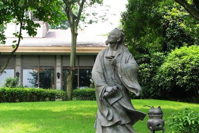茶圣陸羽的仙風道骨讓人駐足不前,遠眺群山的陸羽,激發了人們對先賢的緬懷。茶博陸羽像為青銅制,高約2.5米,并配有低矮的茶桌,置茶爐、茶杯等品茗用具于上,陸羽則站立于旁,衣袂飄然,左手持一茶碗,右手持一茶書,回味著唇齒之間的茶香余韻,神態自若,氣勢生動。