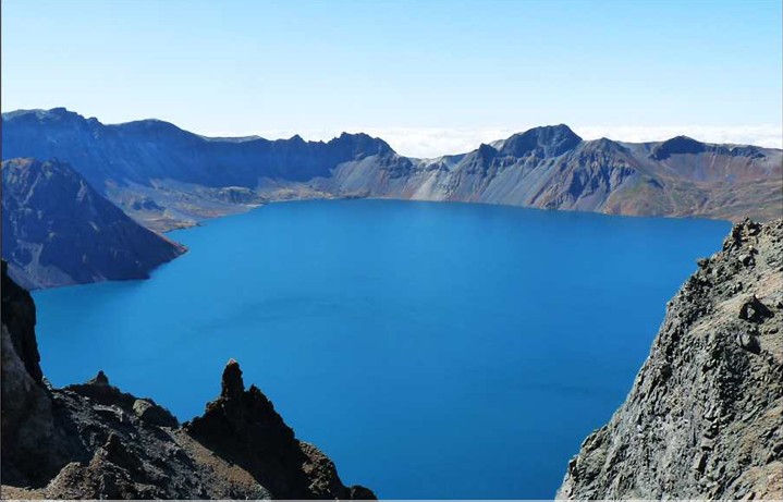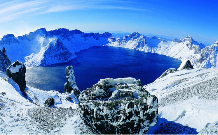 長白山天池是中國最深的湖泊,為1702年火山噴發(fā)后的火口積水而成,高踞于長白山主峰白頭山(海拔2691米,為東北最高峰的山)之巔。湖面海拔2155米,面積9.2平方公里,平均水深204米,為中朝兩國界湖。地理坐標(biāo)為42°00′北,128°03′東。湖周峭壁百丈,環(huán)湖群峰環(huán)抱。這里氣候多變,常有蒸氣彌漫,瞬間風(fēng)雨霧靄,宛若縹緲仙境。晴朗時,峰影云朵倒映碧池之中,色彩繽紛,景色誘人。曾盛傳湖中有怪獸,轟動一時,至今仍為一謎。周圍有小天池鏡湖、長白溫泉帶等諸多勝景。