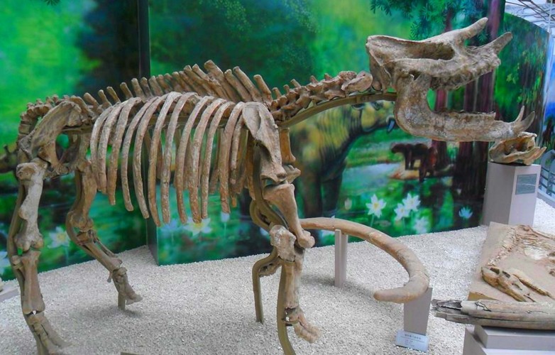 黑龍江滿州龍是一類大型的鴨嘴龍,體長10.50m,體高6.1m,嘴巴象鴨子是其最大的特征。它屬于素食龍,牙齒小而多,前肢細小而后肢粗壯。該恐龍骨架產于黑龍江省嘉陰縣,生活在6500萬年前的白堊紀末期。因其含有50%的真化石,在世界恐龍化石中占有重要地位,構成了地大逸夫博物館的顯著標志。