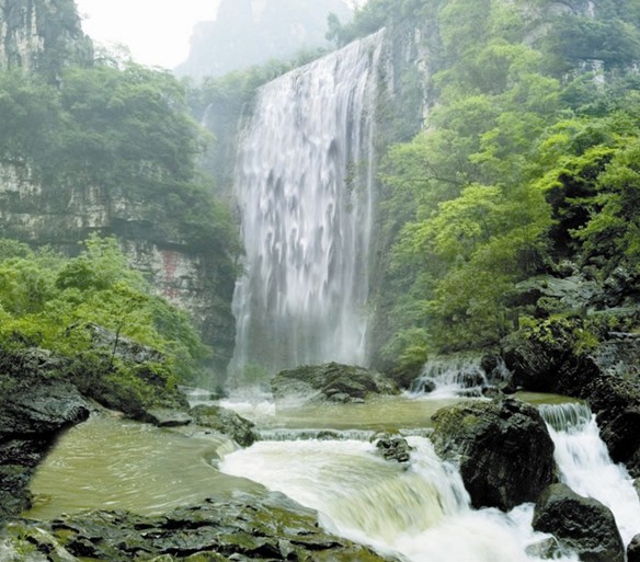 三峽大瀑布即白果樹瀑布,是長江三峽西陵峽口新辟的以飛泉馳名的旅游景點,它距宜昌市34公里,位于宜昌縣曉峰鄉泰山廟。在長約5公里的峽谷中,絕壁夾天,深潭無底,飛泉竟懸,一條主體瀑布和若干分支瀑布形成了氣勢磅礴的瀑布群,主體瀑布寬約數十米,清泉從百余米高的陡峭山崖飛流直下,接天連地,水天霧海,蔚為壯觀,即使久旱不雨,這里依然是飛泉不絕,被譽為“中國第四,湖北第一。”游人稱贊說:“朝游白果樹,一山日頭一山霧;午游白果樹,一身涼爽一身舒;暮游白果樹,一片晚霞一片露。”