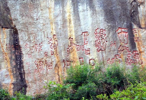 在長10米、高6米的范圍內(nèi),有一片奇特的用鐵紅色顏料書寫的古文字,文字大小不一,大者如人,小者如斗,非鑿非刻,似篆非篆,神秘莫測。當?shù)匕傩辗Q之為“紅崖天書”。近百年來,“紅崖天書”引起了眾多中外學者的研究興趣,曾有“諸葛碑”、“古彝文”、“自然石花”等推斷,甚至有人推測這是外星人留下的遺跡。據(jù)說郭沫若、丁文江等著名學者也曾嘗試破譯,但一直沒有定論。