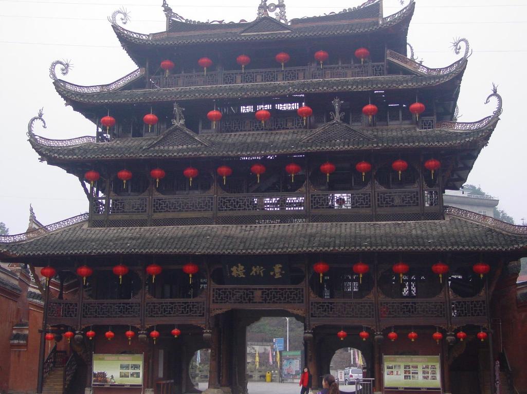 土司城門樓高25米,寬12米,是棟純粹榫卯結構的木樓。高大壯觀、結構精良;布局精巧合理。兩邊走馬轉角樓梯可盤旋至頂,層層相通相連。門樓門窗由200扇門,189塊鏤空雕花圖案組成,內容多為戲文及民間傳奇故事。有趣的是,整座門樓還隱含著許多奇巧而又寓意雙關的數字,如門樓高4層、12根柱、24根梁。那意味著什么呢?意味著一年中的4季、12個月和24個節氣。還有門樓屋頂上數只蝙蝠拱托著一枚古錢的裝飾雕塑,它叫"福在眼前"。福就是借指蝙蝠,錢就是那枚銅錢了。真算是無字勝似有字,于無聲處說吉祥了。