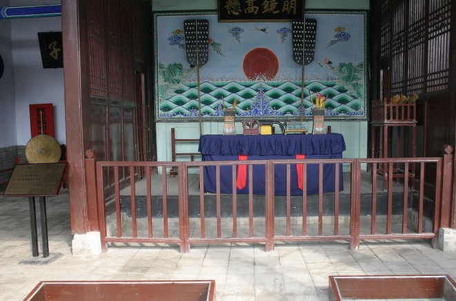 照壁對(duì)面的牌坊叫“宣化坊”,它的南面書“菊潭古治”,北面書“宣化”二字,是知縣每月的初一、十五宣講圣諭、教化百姓的地方。大門面闊三間,明間為過(guò)道,東梢間的前半間置“喊冤鼓”一架,供百姓擊鼓鳴冤之用;西梢間的前半間立有兩通石碑,上面刻有“誣告加三等,越訴笞五十”,更增加了縣衙的嚴(yán)肅性。大門是門子打更報(bào)時(shí)、監(jiān)管進(jìn)出人員的第一道防衛(wèi)之門。我們進(jìn)大門后,現(xiàn)在看到東邊的建筑叫寅賓館、衙神廟、三班院,西邊建筑是膳館和國(guó)內(nèi)僅存的清代監(jiān)獄。從大門到大堂百米甬道的中央有道門,叫儀門,是官府的第二道門。中間的大門過(guò)去時(shí)常不開,只在新官到任的第一天或迎接州、府官員時(shí)才可打開;儀門東西兩邊還各有一個(gè)小門,東邊的門叫生門,過(guò)去時(shí)常開著,供人們的日常出入,西邊的門叫“死門”,又叫鬼門,當(dāng)犯人被判處死刑之后,從西門拉出去行刑,所以舊時(shí)處決犯人叫走西門或上西天。