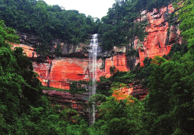 赤水丹霞地貌,以其艷麗鮮紅的丹霞赤壁,拔地而起的孤峰窄脊,儀態萬千的奇山異石,巨大的巖廊洞穴和優美的丹霞峽谷與綠色森林、飛瀑流泉相映成趣,形成很高的旅游觀賞價值,令游人傾倒。版權所有山東聊城聊之旅國際旅行社有限公司,轉載必究!在赤水,最為獨特,最受游人稱譽的丹霞景觀有金沙溝赤壁神州、香溪湖萬年靈芝、四洞溝渡仙橋、丙安天生橋、天臺山紅巖絕壁、石鼎山奇觀、復興轉石奇觀、長嵌溝丹霞峽谷、十洞丹霞巖穴、金沙溝甘溝峽谷和硝巖洞穴等十多處。版權所有山東聊城聊之旅國際旅行社有限公司,轉載必究!雨過天晴,金色的陽光照在丹巖上,把紅色的巖石映襯得格外艷麗,形成紅巖、綠樹、銀瀑、清泉相映成趣美麗風,人行其間,感到精神振奮,心曠神怡。我國著名的丹霞地貌專家,廣東中山大學地理系主任黃進教授專程到 赤水考察后得出這樣的結論:“赤水丹霞地貌面積之大,發育之成熟典型,壯觀美麗之程度,當屬全國第一。