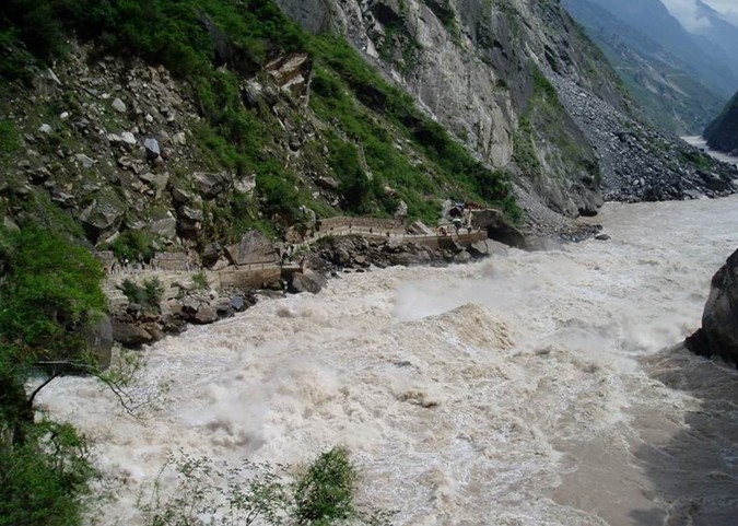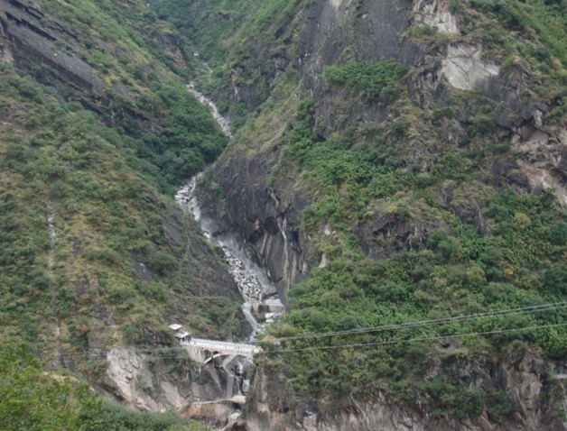 虎跳峽峽口海拔1800米;南岸的玉龍雪山海拔5596米,臨峽一側(cè)山體陡峭,幾乎是絕壁,無路可尋;北岸的哈巴雪山海拔5386米,臨峽一側(cè)山坡稍緩,這一側(cè)有一條簡(jiǎn)易的碎石公路,貫通全峽,公路上方還有一條步行小路。