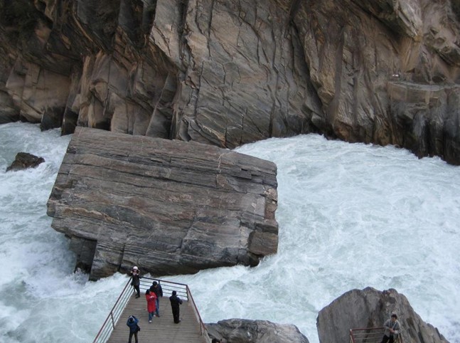 上虎跳是峽谷中最窄的一段,離公路邊的虎跳峽鎮(zhèn)9公里,其江心雄踞一塊巨石,橫臥中流,如一道跌瀑高坎陡立眼前,把激流一分為二,驚濤震天。傳說曾有一猛虎借江心這塊巨石,玉龍雪山一側(cè),一躍而跳到哈巴雪山,故此石取名虎跳石。