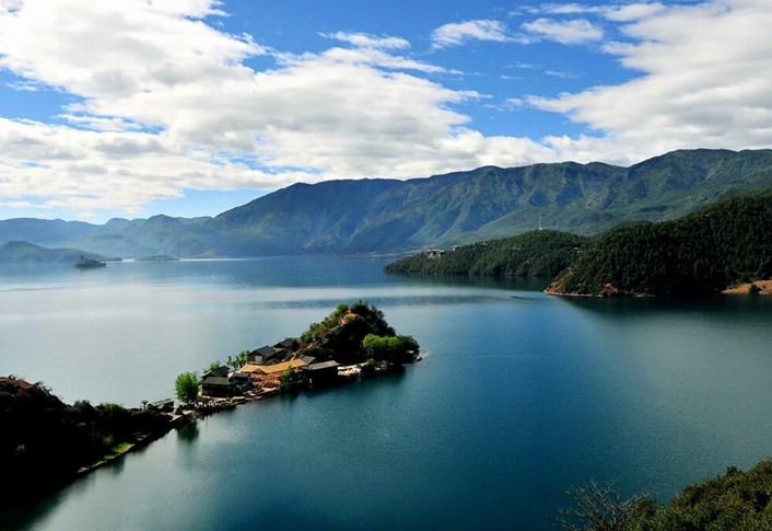 瀘沽湖不僅水清,而且島美。瀘沽湖四周青山環(huán)抱,湖岸曲折多灣,共有17個(gè)沙灘、14個(gè)海灣;湖中散布5個(gè)全島、3個(gè)半島、1個(gè)海堤連島,一般高出水面15至30公尺,遠(yuǎn)看象一只只綠色的船,飄浮在湖面。其中,寧蒗一側(cè)的黑瓦吾島、里無比島和里格島,成為湖中最具觀賞和游覽價(jià)值的三個(gè)景點(diǎn),被譽(yù)為“瀘沽三島”。黑瓦吾島位于湖心,距離湖岸落水村2500米,島上樹術(shù)蔥籠,百鳥群集,是南來北往的候鳥、野鴨的棲息之處,也是昔日永寧土司阿云山總管的水上行宮,美國學(xué)者洛克也曾旅居于此。