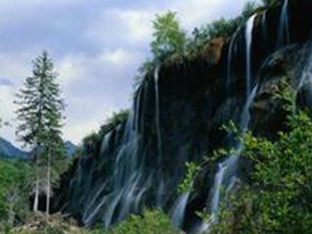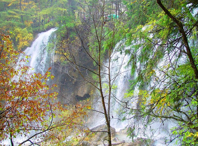 縱攬我國瀑布,或從斷崖驀然跌下,勢若大海倒瀉,銀河決口,聲勢恢宏;或從峭壁凌空飛落,狀如白綾脫軸、裊裊娜娜,姿態千般;或從洞上翻崖直下,形若水晶珠簾,垂掛洞前,妙趣橫生。而九寨溝瀑布群,則從長滿樹木的懸崖或灘上悄悄流出,瀑布往往被分成無數股細小的水流,或輕盈緩慢,或急流直瀉,千姿百態,妙不可言,加上四周群山疊翠,滿目青蔥,至金秋時節,層林盡染,瀑布之景就更為神奇秀麗了。