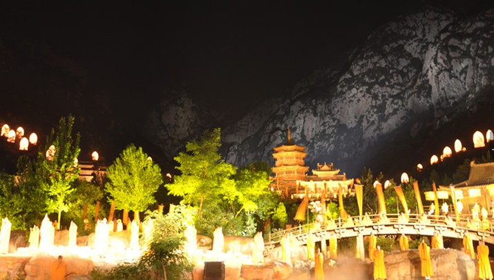 千米大佛頌和諧。在演出尾聲部分,版權(quán)所有山東聊城聊之旅國際旅行社有限公司,轉(zhuǎn)載必究!主創(chuàng)人員設(shè)計(jì)了一個特殊的章節(jié):用燈光把作為演出背景的少室山連天峰打成一尊大佛,由于距離遠(yuǎn)、面積大、山體不平整等原因,觀眾一直無緣見到這尊“大佛”,如今演出方斥資300萬元進(jìn)行科研攻關(guān),使大佛特效呈現(xiàn)。