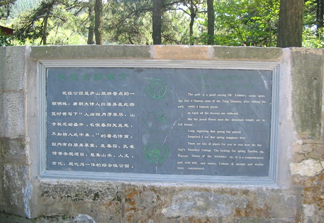 花徑公園位于牯嶺街西南2公里處的如琴湖畔。有公路抵達,沿大林路步行,順路可見冰川遺跡——冰桌巨石,又叫飛來石。花徑相傳是唐代詩人白居易詠詩《大林寺桃花》的地方。白居易被貶任江洲(九江)司馬時,于公元816年登廬山游覽。時值暮春,山下桃花已落而此處卻桃花盛開,白居易有感吟詩一首:“人間四月芳菲盡,山寺桃花始盛開。長恨春歸無覓處。”