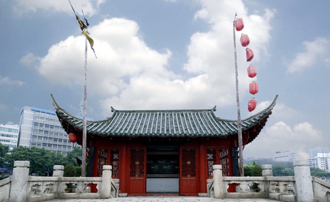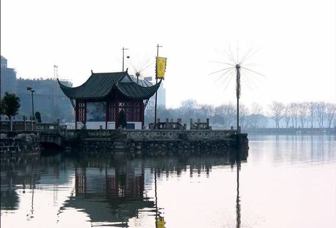 周瑜點將臺位于江西省九江市東北古桑落洲上(今安徽省安慶市宿松縣匯口鎮(zhèn)曹湖村),為一丈多高城樓,臺基長30米,寬16米,花崗石砌,建在傳說的點將臺遺址上面。現(xiàn)樓,明天順二年冬重修,臺上建筑磚木結(jié)構(gòu),版權(quán)所有山東聊城聊之旅國際旅行社有限公司,轉(zhuǎn)載必究!長18米,寬11米,面積200多平方米,分正廳與左右?guī)浚壳傲⒅拘ù┘埽干従椩萍y或花鳥紋,頂為碧翠的琉璃瓦,四角起翹,雕梁畫棟,頗顯壯觀。雖一度稱鐘鼓樓,一般仍叫周瑜點將臺。傳說是東吳大都督周公瑾檢閱水師和操練兵馬的地方,故臺前原有周瑜石馬槽,毀于1966年。據(jù)《三國志周瑜傳》記:“建安十一年,周瑜督討麻保二屯,還兵守備宮亭(指鄱陽湖)。又敗江夏太守黃祖,并生擒其部將鄧龍于柴桑(今九江縣)。”又據(jù)《志》記載:“漢建安十四年,孫權(quán)曾命周瑜向鄱陽湖教習水軍”,可見,原來確實有臺用以點將,亦可想像昔日臺上旌旗招展,前場刀光戟影,湖面戰(zhàn)船穿梭,壯烈激越的場面。如今登上城樓,憑欄放目,湖水波茫,漁帆點影,清風徐來,令人陶醉。 九江市區(qū)甘棠湖中煙水亭前亦建有周瑜點將臺。