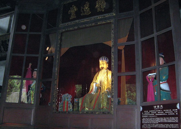 劉備殿后,下數節臺階(武侯祠低于漢昭烈廟,象征古代君臣關系),是一座過廳,掛有“武侯祠”匾額。武侯祠是紀念三國時蜀漢丞相武鄉侯諸葛亮的祠堂,諸葛亮生前封“武鄉侯”,死后謚號“忠武”,故紀念他的祠堂稱作“武侯祠”。諸葛亮殿懸“名垂宇宙”匾額,兩側為清人趙藩撰書“攻心”聯:“能攻心則反側自消,自古知兵非好戰;不審勢即寬嚴皆誤,后來治蜀要深思。”的聯文,是頗負盛名的一副對聯,借對諸葛亮、蜀漢政權及劉璋政權的成敗得失的分析總結,提醒后人在治蜀、治國時借鑒前人的經驗教訓,要特別注意“攻心”和“審勢”。正殿中供奉著諸葛亮祖孫三代的塑像。殿內正中有諸葛亮頭戴綸巾、手執羽扇的貼金塑像,像前的三面銅鼓相傳是諸葛亮帶兵南征時制作,人稱“諸葛鼓”。鼓上有精致的圖案花紋,為珍貴的歷史文物。大殿頂梁由烏木制成,上書諸葛亮寫給兒子諸葛瞻《誡子書》中“非澹泊無以明志,非寧靜無以致遠”(不看輕世俗的名利就不能明確自己的志向,不是身心寧靜就不能實現遠大的理想)。諸葛瞻及其子尚在綿竹抗擊魏將鄧艾的戰斗中不幸身亡。