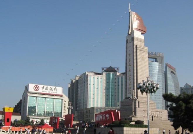紀念塔拆下的材料還可以重新利用,可以節(jié)省費用。原先塔身標有的“1927-1977"現(xiàn)在改為“1927、8、1”,更有利于老百姓追記。階梯的長度有5200米。新的紀念塔軍旗與塔身的連接處用許多“八一、八一……”連成一個“長城”,材料比以前要更精細,北邊是以漢白玉為底色,金銅字熠熠生輝,點綴著紅色斑點的花崗巖,象征著革命烈士的鮮血;側面圖案以萬年青為底色,顯得永久常青。
