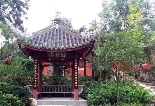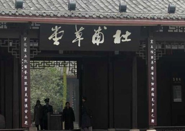 如今的草堂是在明代所建工部草堂遺址上,于八十年代重建的仿古園林建筑群。草堂內詩圣生平館,中院宏偉的詩史堂,花木扶疏的后院。暖融融的春陽下,幾樹海棠開得正艷,火焰般的花朵給清靜的小院平添了幾分亮色。碧綠的荷池中佇立著一尊杜甫的全身塑像,詩人撫袖昂首,滿含憂患的雙眼遙望著遠方。這情景使你想起那令人不堪回首的一幕:公元770年冬的一天,杜甫在離開四川后,終因病痛纏身,窮困潦倒而客死于湘江上的一艘小船上。"青春作伴好還鄉"對于詩人來說,只是一個無法實現的夢……