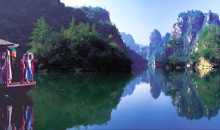 穿過雙門迎賓,從石筍林立的龍舞廳前行不遠,經龍王爺的兵器“金戈”“銀槍”,便到達著名景點“響水河”了。響水河是黃龍洞第二層的一條陰河,全長2800米,目前乘船游覽其中的一段為800米,時間8分鐘左右,水深平均在6米,水溫常年在攝氏15度左右,盛產國家二級保護動物娃娃魚和通體透明的“玻璃魚”。蕩舟響水河,沿途充滿神秘誘惑的風景,如龍王金盔、海螺吹天等景點都值得您慢慢欣賞和品味。空谷幽邃,岸危穹高。忽仰忽傾,若明若暗,恍若回到混沌的遠古時代。響水河年接待游客量已突破一百萬人,在當今世界上屬于最繁忙的陰河。