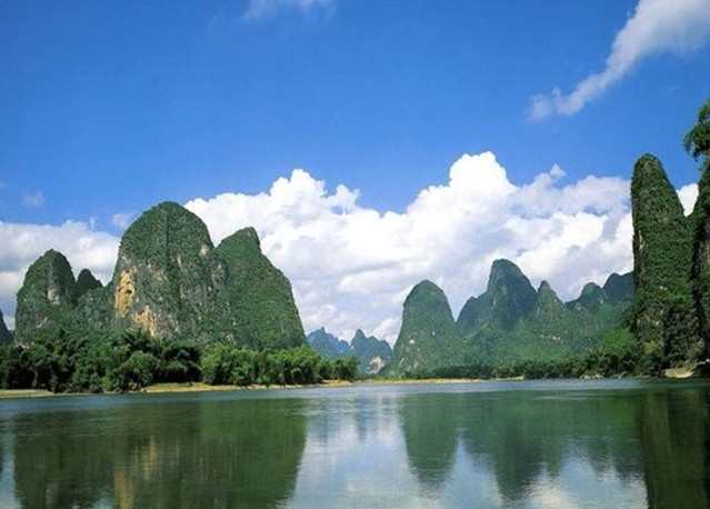 黃布倒影是漓江精華中的精華,位于漓江83公里精華段興坪古鎮(zhèn)境內(nèi),游船經(jīng)過楊堤,過了九馬畫山,江面逐漸開闊,水平如鏡,青峰倒影,美不勝收。離畫山之南不遠,便是黃布灘。漓江山色之美,美在倒影中;漓江倒影之美,就數(shù)黃布灘倒影最為醉人。這里江流清澈,碧綠透底,從水面上可以看到江底有塊米黃色的大石板,長、寬各數(shù)丈,恰似一匹黃布平鋪在河床之上,黃布灘由此得名。
