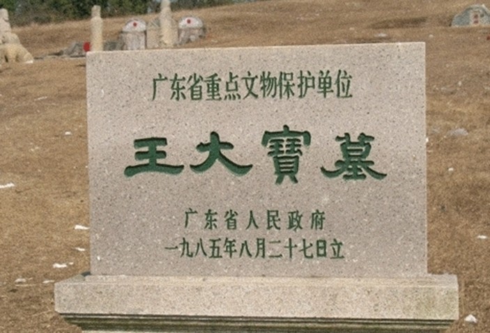 王大寶墓位于潮安縣歸湖鎮神前村的神前山,其地俗稱沉江月,占地約4畝,筑于宋乾道六年(1170)。墓地向西,墓碑高約2.3米,楷書陰刻“宋禮部尚書大寶王公墓”。墓前排列著南宋大型石雕群,計文武翁仲、石獅、石羊、石筍、石望柱、石馬等14件,石雕線條粗擴,工藝簡練古樸,反映了南宋的雕刻藝術水平和風格,是廣東省現存為數不多的大型宋代石雕。1989年王大寶墓被列為廣東省重點文物保護單位。