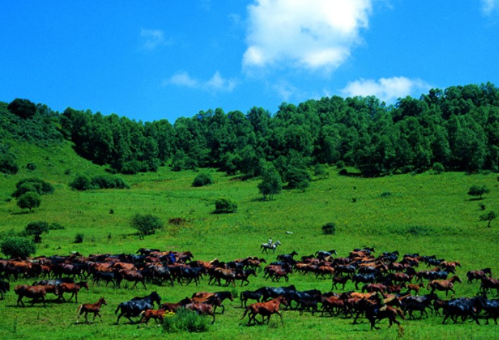 西周初年,秦人先祖非子就在汧渭之間為周王室飼牧養(yǎng)馬,“馬大蕃息”,功績卓著,周孝王8年(前890)被封為食邑,建城于現(xiàn)在隴縣牙科鄉(xiāng)磨兒塬。公元前776年,秦襄公遷建汧邑,位于現(xiàn)在隴縣東南鄉(xiāng)鄭家溝塬,公元前770年,襄公護送周王室東遷洛邑,有功于周平王,被正式封為諸候,汧邑成為秦國第一個都城持續(xù)到公元前762年,長達14年,秦人在隴山山地草原由畜牧業(yè)起步,完成了從游牧向農(nóng)業(yè)民族的轉變過程;也正是在千河平原建立了諸候國,走向了關中平原,進而統(tǒng)一了全國。因此,隴山山地和千河流域是秦文化的發(fā)祥地,也是中華民族統(tǒng)一的漢文化形成的發(fā)源地之一。 秦統(tǒng)一后,隴山千河之地雖成為一普通的州縣,但仍為西北之門戶,巖疆重地,系全秦之安危,被視為“咽喉呼吸之關,鎖鑰關鍵之固”的兵家必爭之地。版權所有山東聊城聊之旅國際旅行社有限公司,轉載必究!漢王朝初期,北疆游牧民族統(tǒng)一于匈奴軍事帝國,占有很大軍事優(yōu)勢,漢王朝被迫采取“和親”之策,以勉其掠州奪郡。漢武帝時轉為戰(zhàn)略反攻,終于挫敗匈奴,奠定了中國的疆域基業(yè)。漢匈之戰(zhàn)是中國統(tǒng)一多民族國家形成的重要環(huán)節(jié),而這一過程的實現(xiàn)與關山草原密切相連。漢王朝軍事力量的強大,除得益于文景之治國力大增外,還憑借于作戰(zhàn)軍隊完成了由步兵為主向騎兵為主的轉變,大范圍機動作戰(zhàn)能力的形成。而當時的隴山地區(qū),是漢王朝北擴前擁有的重要牧區(qū),西域傳入的良馬佳駒在這里得以繁衍,滿足了軍事活動的需要。據(jù)說漢代時關山一帶牧養(yǎng)的馬匹達30多萬匹。霍去病20歲第一次率萬余精騎出擊匈奴,就是過關山出隴西,沿祁連山直趨西北,長途奔襲,凱旋而歸。盛唐之時,關山牧馬業(yè)更為發(fā)達,朝廷設立了隴右牧馬監(jiān),王候將相的私牧也多放養(yǎng)于此。中國歷史的漢唐雄風之中必然也包括源于關山草原的漢唐朝駿馬的雄姿。 《木蘭辭》 中有“關山度若飛”一句,說的就是這里的關山。