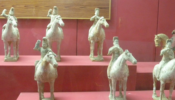 該館館藏文物4500多件,是研究初唐政治、經(jīng)濟(jì)、文化的寶貴實(shí)物資料。鄭仁泰、張士貴等墓出土的彩繪釉陶俑,是唐三彩的前身。李貞、安元壽等墓出土的唐三彩,雄渾斑爛,雍容華貴。李勣墓出土的“三梁進(jìn)德冠”,是中國(guó)目前發(fā)現(xiàn)的最古的一頂進(jìn)德冠。諸多陪葬墓出土的神態(tài)各異的胡俑和駱駝俑,反映了初唐時(shí)期絲綢之路的盛況,體現(xiàn)著初唐時(shí)期中國(guó)各民族的大融合。