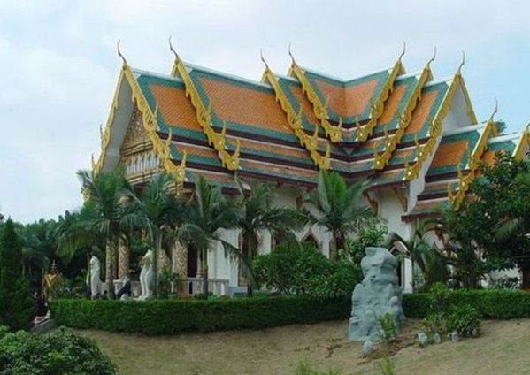 大殿總高19米,建筑面積490平方米。墻為白色,屋角、窗頂尖形,瓦似魚(yú)鱗并染青或黃色,屋檐頂端配有一支支向天的黃色裝飾圖案,新穎壯觀。內(nèi)部布置莊嚴(yán),有精美的壁畫(huà)《佛陀的故事》,但沒(méi)有中國(guó)通常的三如來(lái)或西方三圣,僅有一尊泰式跏跌坐式大型銅鑄佛陀圣像,連同蓮座高3米余,重1.5噸,金光閃閃,妙相莊嚴(yán)。東殿供奉一尊護(hù)法尊者(即四面佛)像。這位護(hù)法神,即是大梵天,本是婆羅門(mén)教,印度教的創(chuàng)造之神。