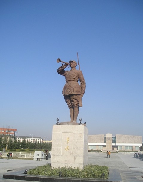 建軍廣場位于鹽城市市區(qū)最繁華路段的中心,即建軍路和解放路的交界處,此處原是鹽城市地理中心位置,鹽城市的城市的發(fā)展也由此點向四周擴(kuò)展。建軍廣場中間有一個新四軍騎馬的銅像,這個廣場俗稱為銅馬廣場。以新四軍騎兵銅像為主體的新四軍重建軍部紀(jì)念塔是鹽城的城市標(biāo)志;塑像是根據(jù)新四軍老戰(zhàn)士管文蔚的具體設(shè)想,由中央美術(shù)學(xué)院雕塑主任王克慶教授創(chuàng)作設(shè)計的:一位年輕英武的新四軍戰(zhàn)士身背大刀,手握韁繩,騎在高揚(yáng)前蹄的戰(zhàn)馬背上,面向太陽昂首前進(jìn),象征新四軍東進(jìn),開辟華中敵后抗日根據(jù)地。塑像高4米,長3.8米,重3250公斤。塔座用黑色花崗巖砌成,四面呈梯形,正面朝東,刻由原新四軍第四師師長張愛萍上將親筆題詞:“新四軍重建軍部紀(jì)念塔。” 背面朝西,上刻由張愛萍上將審定的碑文,已故書法家鮑審手書。