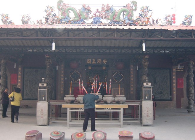 由于船和鳳凰塔都能在廟前看到,故人們印象深刻而傳誦一時(shí),此聯(lián)為惠來(lái)舉人卓晏春(1839至1890年)所撰。廟正門(mén)兩邊的旁門(mén)較小,門(mén)上石匾分別刻著“崇德”和“翼疆”,小門(mén)也有門(mén)聯(lián),但因沒(méi)有卓晏春撰的精采和實(shí)際而被遺忘了。廟內(nèi)的安濟(jì)圣王像披有黃色繡金線龍袍戴著皇冠,金身高達(dá)八尺,由堅(jiān)硬楠木刻成。但不是施所學(xué)從云南帶來(lái)的小神像,那小神像先前放在南門(mén)謝氏宗祠。據(jù)說(shuō)至今保存完好。廟中圣王像要比兩邊的大夫人和二夫人像大得好多,以示威武神圣。