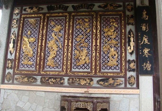 后廳。也就是大雄寶殿,系宮殿式建筑,精工雕飾,翹角飛檐,氣勢壯觀。脊頂嵌瓷“雙龍朝火寶”,是饒平縣老工藝師蔡佳余妙作。殿前走廊,置一長方形香案。正殿與走廊間,有彩色雕欄,校址 有精美的窗扇。