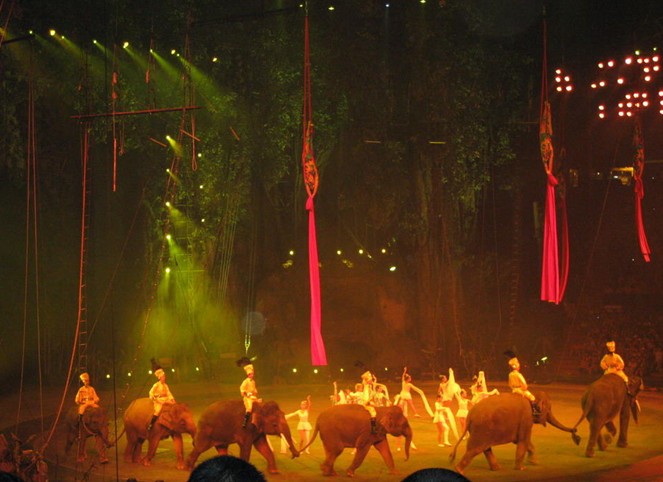 演出場地使用各種電腦燈、馬田燈等燈光多達2000多支,奢華的燈光投入營造了從清晨、白天、黃昏到夜間的多種效果,極大地增強了舞臺效果的豐富性和時空感,300多名中外演職人員,400多只訓練有素的動物在一場馬戲演出中同臺演出。