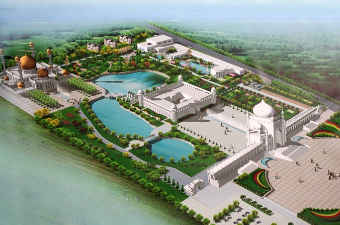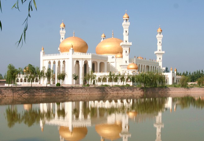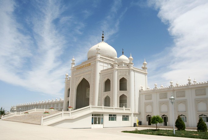 中華回鄉文化園主體大門是借鑒印度泰姬陵設計建造的。她高38米,長206米,即便是站在很遠的地方也能夠看得到她的身影。站在她的面前,她的高大、偉岸、恢宏,給你以視覺的沖擊。走近她,她潔白的身軀、飽滿的穹頂、絢麗的浮雕、繽紛的彩繪、精巧的結構,在藍天白云的映襯下,給你的是心靈的震撼。來到這里,你會被她濃郁的伊斯蘭風格所吸引、所感染、所陶醉;你會明白什么是圣潔的天堂;你還會深深的感受到,來到這里心靈即將經受一次伊斯蘭文化的洗禮。這是建園人的夢想,也是所要達到的目的,更是中華回鄉文化園所要突出的主題。