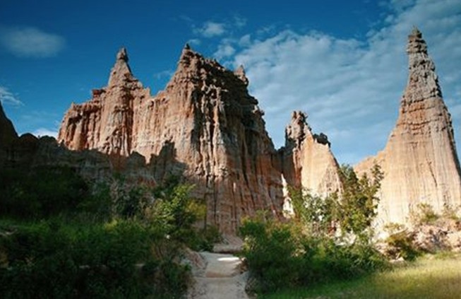 虎跳灘土林的景點分布在主溝和支溝兩側。主溝為東西向的干涸河床,寬10?40米,總長1500米,河床表面為黃色細砂和彩色礫石。支溝分布在主溝南北兩則,寬0.5-8米,總長4300米。土林佳景大多集中在支溝兩側。主溝的北側有元帥府,古堡幽情,駱駝峰3條支溝;南側有無名溝,歐亞奇觀2條支溝;另外還有幾條小支溝尚未命名。版權所有山東聊城聊之旅國際旅行社有限公司,轉載必究!歐亞奇觀是虎跳灘土林最佳景觀,這里土林高大挺拔,造型大都似古代宮廷殿堂,中西合璧,相映生輝。元帥府土林以動物造型為特色,如熊貓、獅、虎、鷹、雕等走獸飛禽,惟妙惟肖。古堡幽情以赤、褐、黑三色土帽蓋頂而取勝。