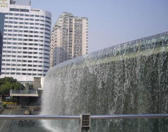 廣州火車東站及其廣場位于新城市中軸線的北段,東站綠化廣場以大面積的綠地營造了一個大尺度的環境空間效果,配以精致的花壇、雕塑、水景,體現了廣州現代化國際城市的都市風采。長89米、高8米的玻璃墻構成了水景瀑布的依托,流水從高平臺溢出,順玻璃墻瀉入水池,各色燈光不斷變幻將瀑布映得五顏六色。