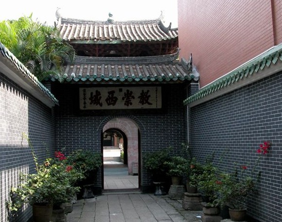 懷圣寺又名獅子寺,俗稱光塔寺,是中國四大古代清真寺之一,也是我國現存最古老的清真寺建筑。位于越秀區光塔路56號,被列為廣東省省級重點文物保護單位。唐、來以來,廣州為我國海外貿易的主要港口,那時廣州的阿拉伯富商最多,他們在當地政府的支持下,修建了一座規德宏大的清真寺,即今日的懷圣寺,寺的命名表達了中外教民對圣人穆罕默德的尊從和懷念。該寺禮拜大殿置于院庭的正面,它是3間帶周圍廊、歇山重檐綠琉璃,帶斗拱的古典式建筑,巍然聳立在帶雕石欄桿的大平臺上,充分顯示了大殿的高貴威嚴、石欄桿板上的雕刻各異,有葫蘆、扇子、傘蓋、花卉、獅子、游魚等物,極為活潑生動。大殿內部潔白明亮,用木地板及三面拉門,殿內裝飾雖少,但很整潔大方。
