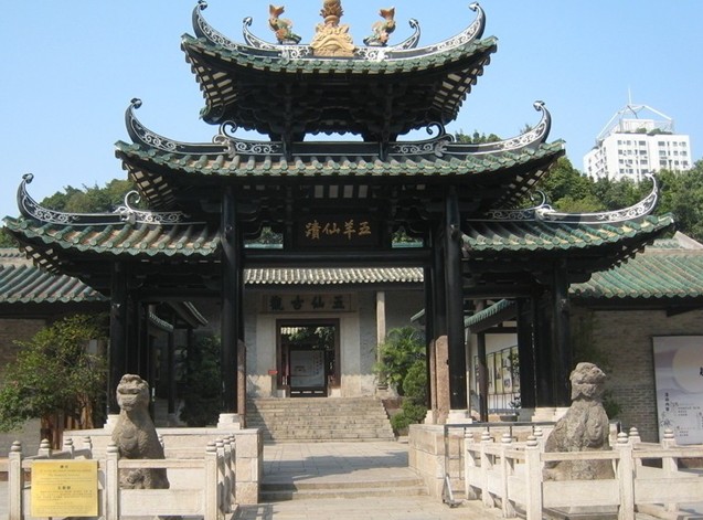 晉朝時,吳修為廣州刺史,還未到任,有五仙人騎五色羊,背著五谷來到廣州州治的廳堂上。吳修于是在廳堂上繪五仙人像以示祥瑞紀念,并且稱廣州為“五仙城”。現在的廣州惠福西路五仙觀據說就是五仙人降臨之地,廣州人為了紀念五仙人,在那兒專門修了五仙觀,在大殿內還有五仙和五羊的塑像。廣州人民為了感激五位仙人,在他們當年降臨的地方修建了一座五仙觀以示紀念。觀中有五仙雕像,伴以五羊石像,五仙又被稱之為谷神。