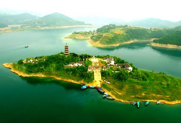 從空中俯看象一只美麗的孔雀開屏,四周又在青山綠水碧波之間,因此取名翠屏島。從安康乘車經瀛湖鎮入進島路全長30公里,距金螺島僅一公里。