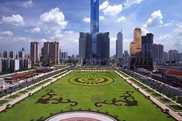 天河東站綠化廣場位于廣州市新城市軸線上,占地面積4.7萬平方米,于1998年9月中旬動工,1999年7月1日正式完成并交付使用。廣場中央綠地2.6萬平方米,鋪種馬尼拉草18315平方米,其中有6000平方米種植標志性的紋樣,分圍種植1300平方米的福建茶綠籬。