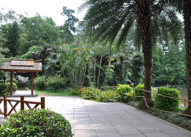 公園環境舒適,草坪舒展,山丘起伏,林木蒼翠,湖波粼粼,好一派自然清新的郊野風情。氣勢宏偉的南北大門景色,門前廣場橫跨寬度達 100 米,建筑風格獨特,植物色彩配置艷麗,布置緊湊,頗有現代公園氣派。最為壯觀的南門中軸廣場,兩側種植風景林,配置各類棕櫚植物,襯托著中央的立體八角花壇,更加洋溢著嶺南園林的氣息。