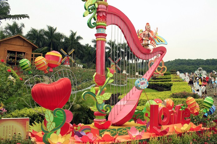 從醉華苑出來可觀望到對面的大型花鐘,花鐘的鐘點數字用不同植物色塊修剪而成,花鐘的時間正好與大家手表的時間吻合,為前來攝影的游客留住精彩瞬間?;ㄧ娤旅媸怯酶魃ɑ芷闯龅闹袊貓D造型,設計巧妙,構思獨特。