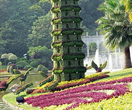 滟湖的水沿中軸線下瀉,使得滟湖成為中軸線的源頭,為了突出這一源頭,園林設計者和建造者又在滟湖的岸邊,建一羅馬柱廊,既突出了軸心線上的景點在云臺花園的作用,又與具有東西合璧特色的花園大門相對應。版權所有山東聊城聊之旅國際旅行社有限公司,轉載必究!更為有趣的是,建造者借鑒了蘇州園林中花墻的效果,在羅馬柱廊的后面又安放了一群圖騰石柱。在軸心線的兩側,云臺大花園分別排列出不同的功能區,200多種中外名貴四時花卉就被巧妙地種植在不同的功能區里。東側在種植各種花卉的同時,還依地勢起伏培植了大面積的草坪,遠遠望去,酷似一條綠色的瀑布。西側是誼園和茶室。誼園中心是一巨大地球石雕,以地球石雕為圓心,在一個巨大的圓周內,分布著已與廣州結為友好城市的市花和友好城市所在國的國花。