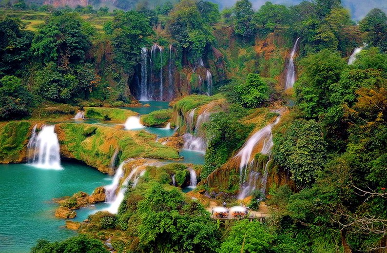 德天瀑布分三層。第一層河水沿筆直的山勢,俯沖而落在百多米下的山潭中,銀瀑飛瀉,震魂攝魄的風采與魅力,搖動人之心旌。第二層比較低緩,山勢在此造了一個幾十米的臺階,讓第一層瀑布猛沖而下后有一個喘息的機會,然后蓄勢而發,形成了最為壯觀的第三層。在第三層已匯聚了從源頭流出的四散的河水,幾乎是垂直流下的水幕,沖擊著寬廣的河面,流淌出一幅掩映在綠樹懷抱中的天然畫卷。