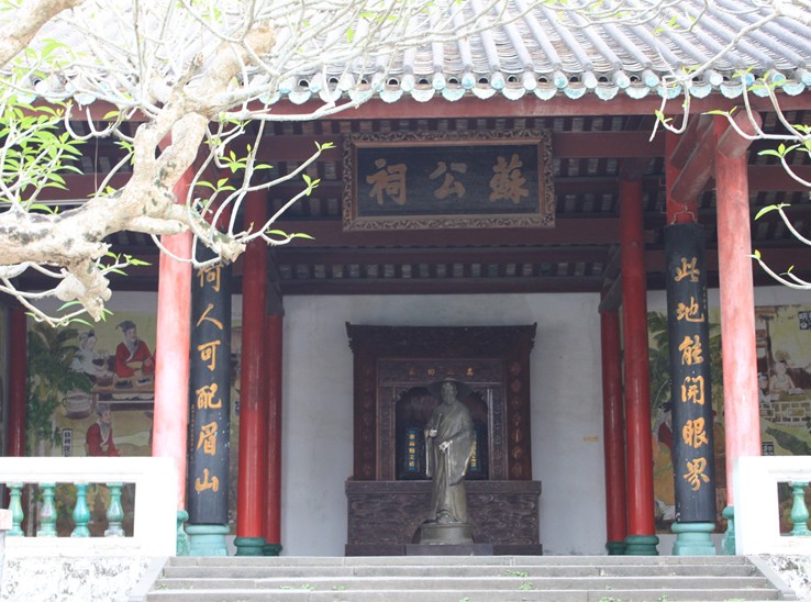 為紀念蘇東坡而建。他北返后,海南學子經常在他曾借寓過的金粟庵入飲酒賦詩,進行學術交流,懷念這位“一代文宗”,久之便把該處題名為“東坡讀書處”。元代在此基礎上開設“東坡書院”,大書法家趙孟頫為之題匾。書院幾經變遷,至明初毀廢,但遺跡尚存。明萬歷45年(1617年)瓊州副使戴禧在原址重建。并改書院為“蘇公祠”,奉祀蘇東坡與其子蘇過。清順治、乾隆年間又對該祠進行重修,光緒15年(1889年),朱采在修建海南第一樓時對蘇公祠進行了較大規模的整修,并增建山門等建筑。現在的蘇公祠基本上是光緒年間建修的規模。蘇公祠山門口陳列的石雕系明代修建蘇公祠時的原物,山門口懸掛明太祖朱元璋贊海南詩句“南溟奇甸”橫匾。蘇公祠正廳陳列著蘇東坡及其子蘇過和學生姜唐佐的牌位。大廳圓柱懸掛民國四年(1915年)由朱為潮撰聯,現代著名書法家麥華三重書的“此地能開眼界,何人可配眉山”的楹聯一付。