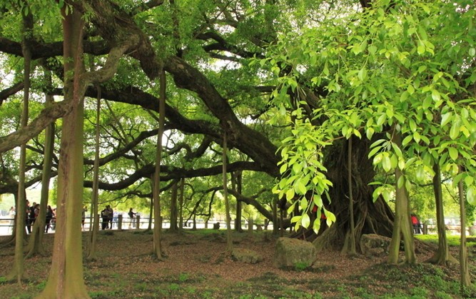大榕樹(shù)蒼老古樸,周?chē)淠叭缈棥⑿『忧宄骸⒍煽陟o待、山峰環(huán)繞。已有1400多年高齡的隋代大榕樹(shù),樹(shù)圍有七米多,高達(dá)十七米,獨(dú)木成林,靜穆凝重。盤(pán)根錯(cuò)節(jié),如同蟒繞龍盤(pán),濃蔭遮天,只有絲絲縷縷陽(yáng)光從縫隙中鉆入。