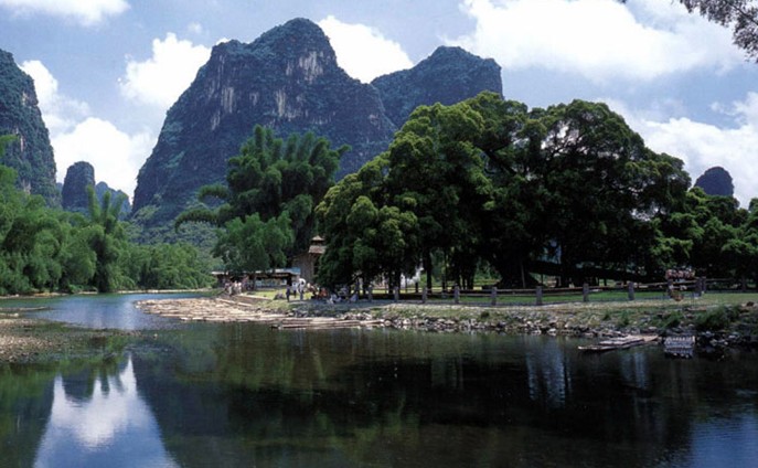 大榕樹(shù)位于陽(yáng)朔縣城南7.5公里。樹(shù)高17米,樹(shù)圍7.05米,遠(yuǎn)望似一綠色巨傘撐立地上。隔河有穿巖,組成穿巖古榕景點(diǎn)。陽(yáng)朔大榕樹(shù)景區(qū)是世界巖溶喀斯特地貌峰林峰叢最集中、最典型、最有代表性的地方,以奇特的巖溶喀斯特地貌、如詩(shī)如畫(huà)般的山水田園風(fēng)光和豐富的壯族少數(shù)民族民俗文化聞名天下。詩(shī)情畫(huà)意韻律優(yōu)美的稻田,清澈見(jiàn)底的小河,青翠濕潤(rùn)的山峰,鳳尾竹,壯家村寨,水車(chē),清新爽人的空氣,標(biāo)示著這里人與自然的完美和諧,更似一幅藝術(shù)水平極高的中國(guó)水墨山水畫(huà)長(zhǎng)卷。曾被美國(guó)哈佛大學(xué)博士、世界著名園林專(zhuān)家卡爾稱(chēng)為:在中國(guó)看到了最美麗的地方。風(fēng)靡中國(guó)及東南亞地區(qū)的電影《劉三姐》很多鏡頭在此拍攝,影片中劉三姐與阿牛哥大榕樹(shù)下拋繡球定終身的情景打動(dòng)了天下有情人。