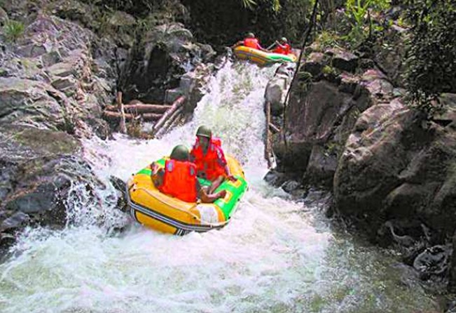 油田礦泉漂流最大的賣點,是其中的高臺沖水之漂,據聞屬于首創。漂流水道落差變化莫測,漂流者的橡皮筏在急流中時沉時浮,從3米高的水道中飛奔而下,人和筏子沖到水底去了,瞬間又浮現了上來,時而蜿蜒于峽谷叢林,或漂浮于天光云影之間。