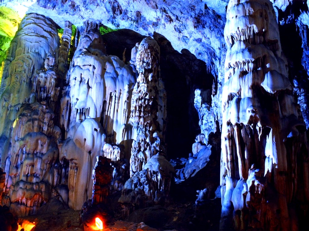 你也會聯想到一首樂曲、一首凝固的樂曲,錯綜的巨大洞口一開始就定下了這首樂曲神秘磅礴的基調,然后變幻為狹窄的幽徑如婉轉的小調進入神秘的“講經堂”和“萬壽宮”而形成強烈對比,讓你感到一種星光隱隱、海波回蕩的交響,這交響演繹成彎彎曲曲的南天門又拐入水晶宮——一段田園風光的插曲,插曲結束是如歌的行板———明朗而華美絢麗的靈霄殿,之后是樂曲的高潮——廣寒宮,神秘深邃的主旋律重復再現直至“銀雨樹”而嘎然中止。不同閱歷的人,想象的角度和內容也不同,還會聯想到了中國的名山大川諸如“水鄉澤國”、“黃土高原”,聯想到了古羅馬城堡和古希臘遺址。你甚至還會發思古之幽情,與這經歷了數十萬年的石頭精靈溝通,渴求一種深切的生命體驗,探尋它的由來。一群年輕的地質科學工作者,沉浸在這種探尋之中。