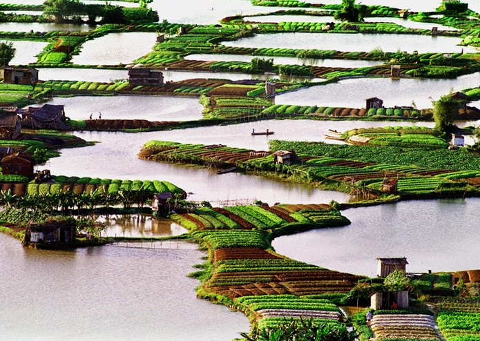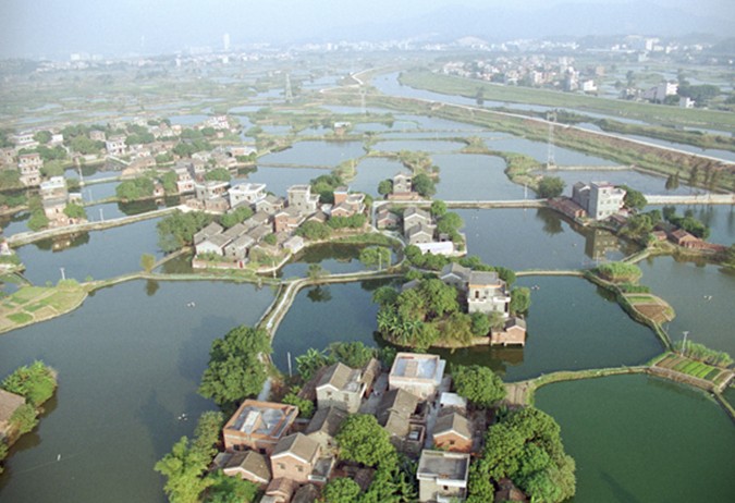 古勞堤內水網縱橫交錯,小艇穿行如梭,兩岸蕉林搖曳,萬畝魚塘似明鏡耀目,千頃桑地綠海翻波,那青青的田疇就像精雕的翡翠,好一派旖旎的南國水鄉風光。