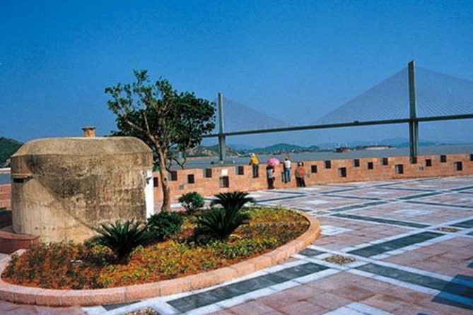 崖門古炮臺位于新會崖門出海水道東岸的古井鎮官沖村,最早設置于清康熙五十七年(1718年),并形成雛形,后于清嘉慶十四年(1809年)正式設立興建。崖門古炮臺雄踞新會崖山,倚山面海,緊緊扼守著珠江八大出海口之一——崖門通往南海的進出水道。崖門大橋是跨越崖門水道的特大型雙塔單索面斜拉橋,全長1289米,跨度668米,橋下可通航5萬噸級船舶,跨度之大為目前國內同類型橋梁之最,亞洲第一,世界第二。