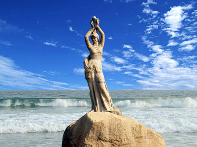 相傳,在一百多年前,這里有位商人特意請(qǐng)來(lái)一位風(fēng)水先生,想讓他幫忙選一塊“風(fēng)水福地”用來(lái)安葬自己的老父,祈求日后子孫后代能興旺發(fā)達(dá)。他跟著風(fēng)水先生順著山脈,沿著海邊一直“追龍”,察看地形。最后,他們來(lái)到香爐灣附近時(shí),太陽(yáng)已經(jīng)下山,一輪明月早以升起,皎潔的月光灑在黑黝黝的峰巒之上,遙看山貌,宛若一頭翹首望月的大犀牛。巧舌如簧的風(fēng)水先生馬上就說(shuō):“嗯!這座犀牛望月山就是一塊能發(fā)跡的風(fēng)水寶地”。商人一聽(tīng),非常滿意。于是,將亡父安葬至此。并且,按照風(fēng)水先生的話,爬上山頂,面向南海,靜靜地許下自己的愿望。過(guò)了兩、三年,商人果然生意興隆,財(cái)運(yùn)亨通,成了富甲一方的巨賈。